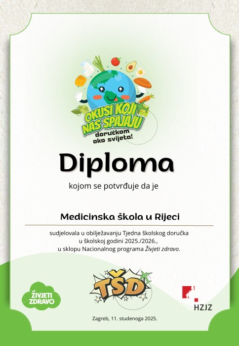 Medicinska škola u Rijeci ponosno je primila diplomu kojom se potvrđuje sudjelovanje u obilježavanju Tjedna školskog doručka u školskoj godini 2025./2026., u sklopu Nacionalnog programa Živjeti zdravo.