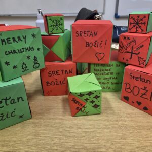 Uz izazovne zadatke, sudionici su imali priliku izraziti i svoju kreativnu stranu kroz izradu origamija, još jednom pokazujući koliko se matematika i umjetnost prirodno nadopunjuju. Škola je ovim povodom ukrašena maštovitim „božićnim poklonima“ izrađenima origami tehnikom, uz prekrasne poruke i želje koje su dodatno obogatile blagdanski ugođaj.