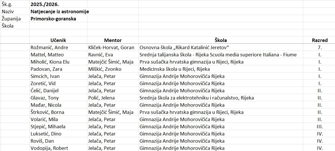 Županijsko Natjecanje iz astronomije održat će se 6. ožujka 2026. u 13.00 sati u Medicinskoj školi u Rijeci. Temeljem rezultata školskog razine na županijsku razinu pozvani su:
